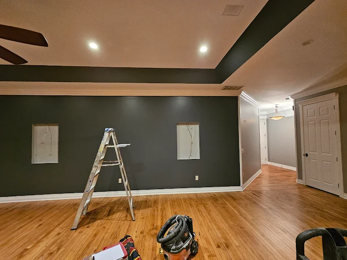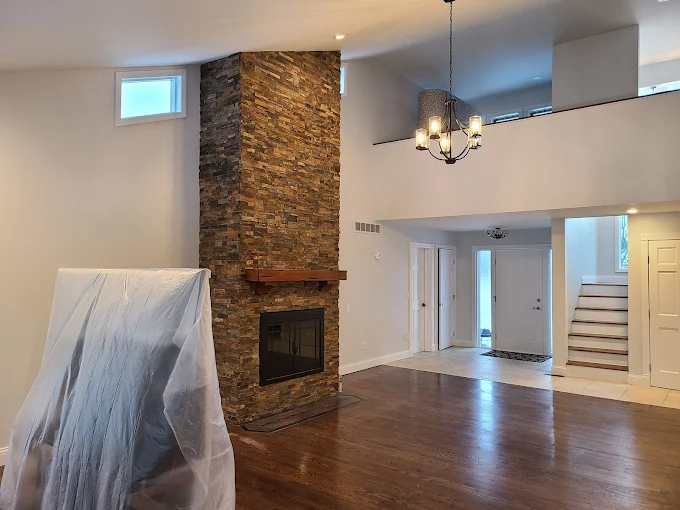 Work in progress! 🚧 We use professional scaffolding to safely reach high ceilings and ensure your great room gets a flawless finish from top to bottom. No corner is cut.