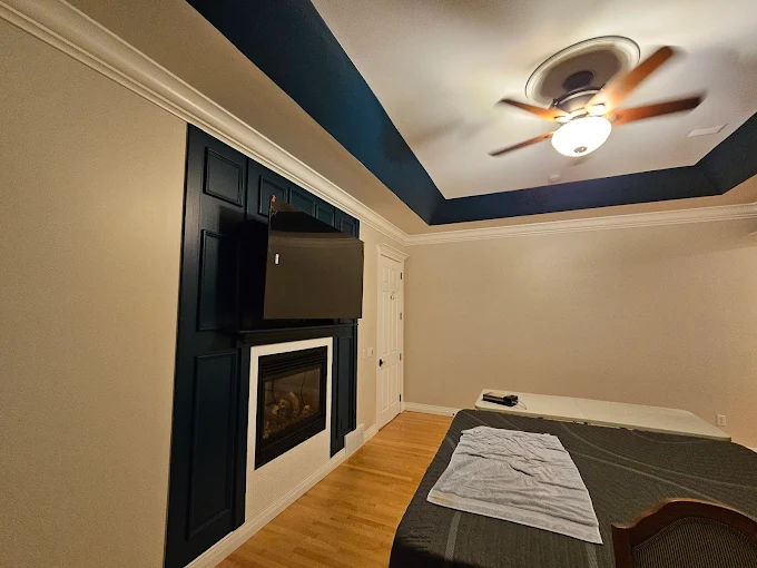 This dark blue accent wall with wainscoting creates a stunning focal point. We specialize in high-end interior painting that elevates your space.