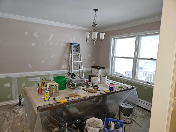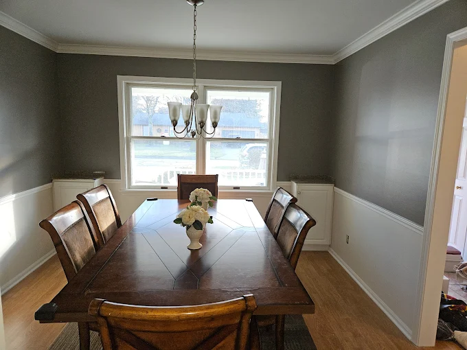 We treat your home with respect. That means covering furniture and floors before we start painting. 🛡️ This dining room is prepped and ready for a two-tone transformation.