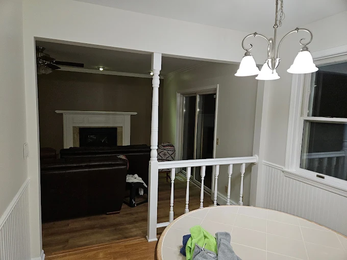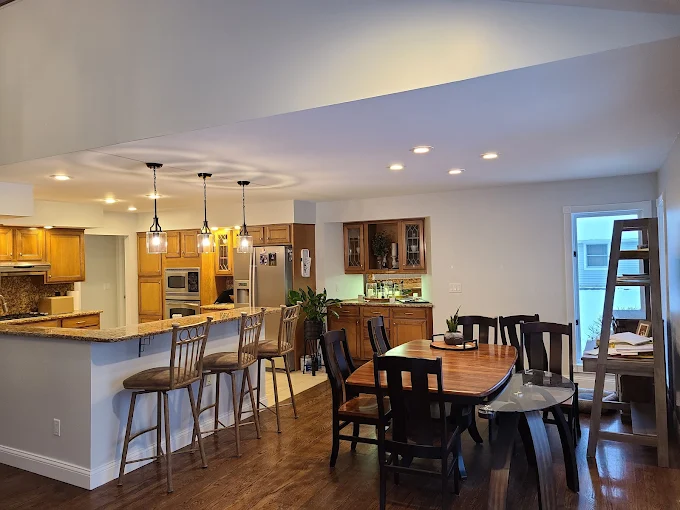 Open-concept dining areas look their best with fresh, clean walls that carry the light. We used premium paints to ensure this space stays looking great.