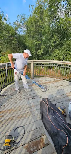 Restoring a deck takes elbow grease and the right tools. We are sanding this surface down to raw wood to ensure the new finish bonds perfectly.