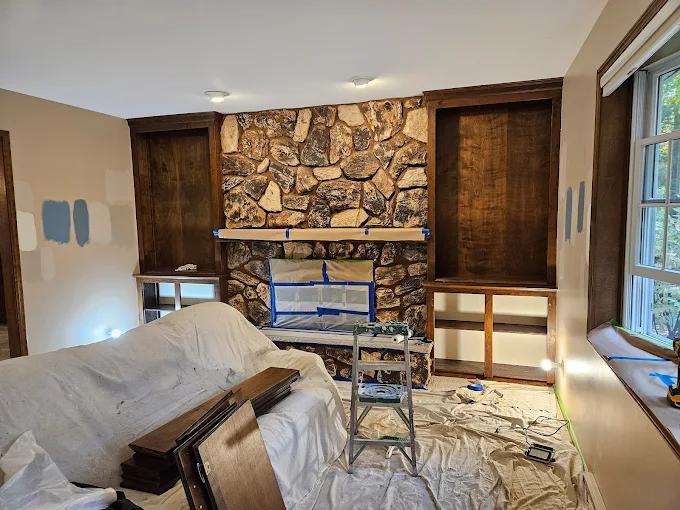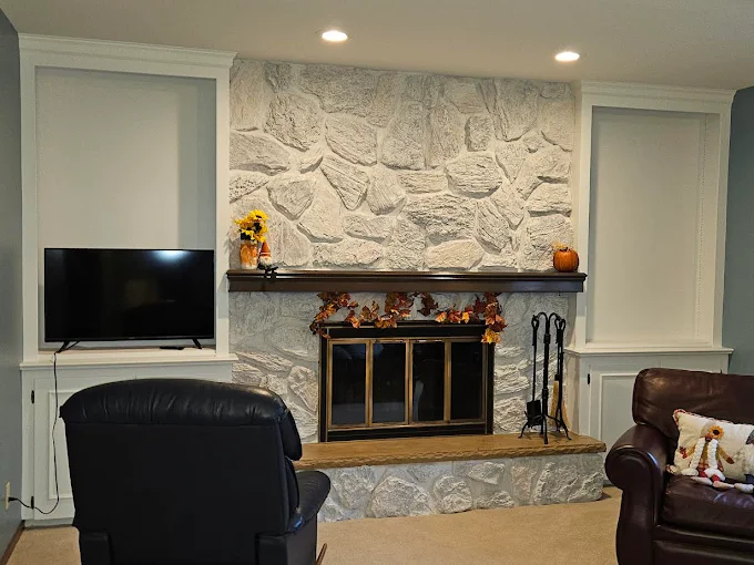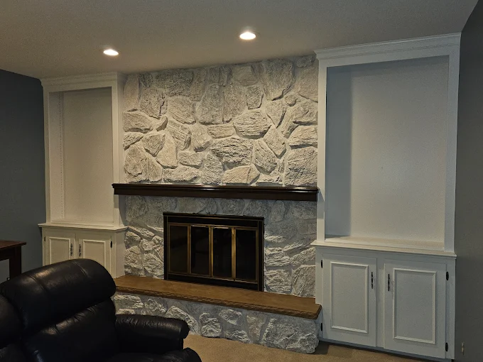 We updated these built-ins to bright white, creating a beautiful contrast with the stone fireplace. Satisfaction guaranteed on every interior project.