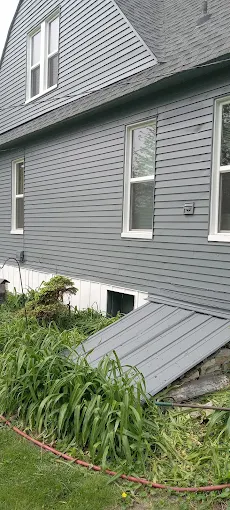 Even difficult areas like cellar doors and foundations get the premium treatment when we are on the job. We finished this exterior in a sharp grey tone.